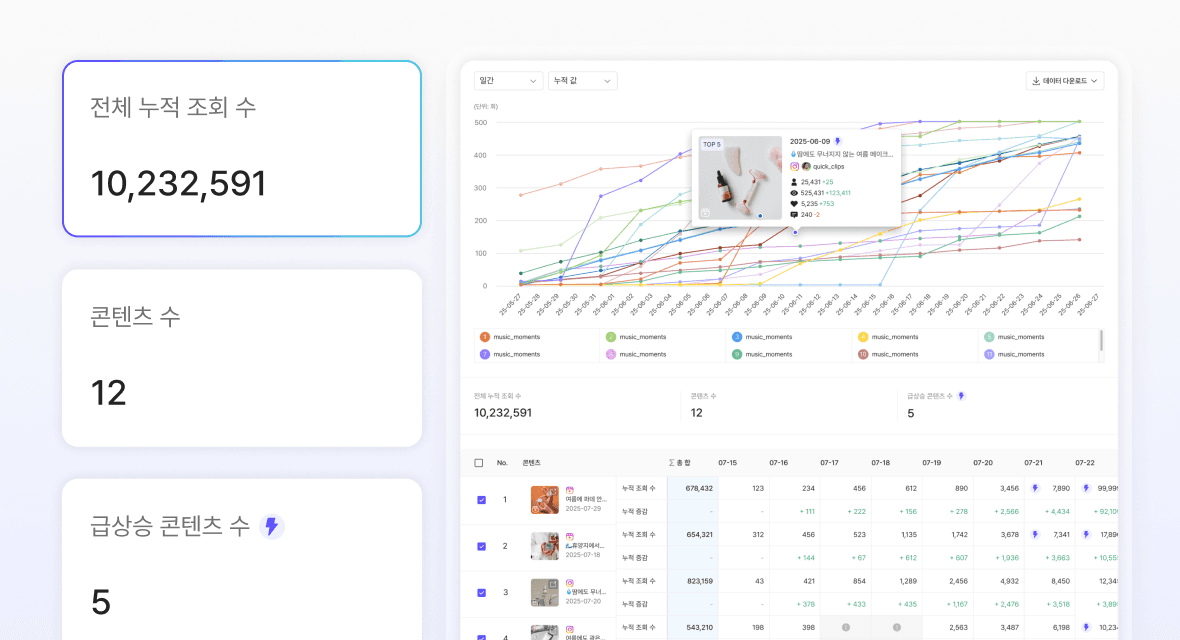 조건만 설정하면 피처링이 콘텐츠를 자동으로 수집하고 추적합니다.수집 상태와 콘텐츠 성과를 한 화면에서 빠르게 확인하세요.