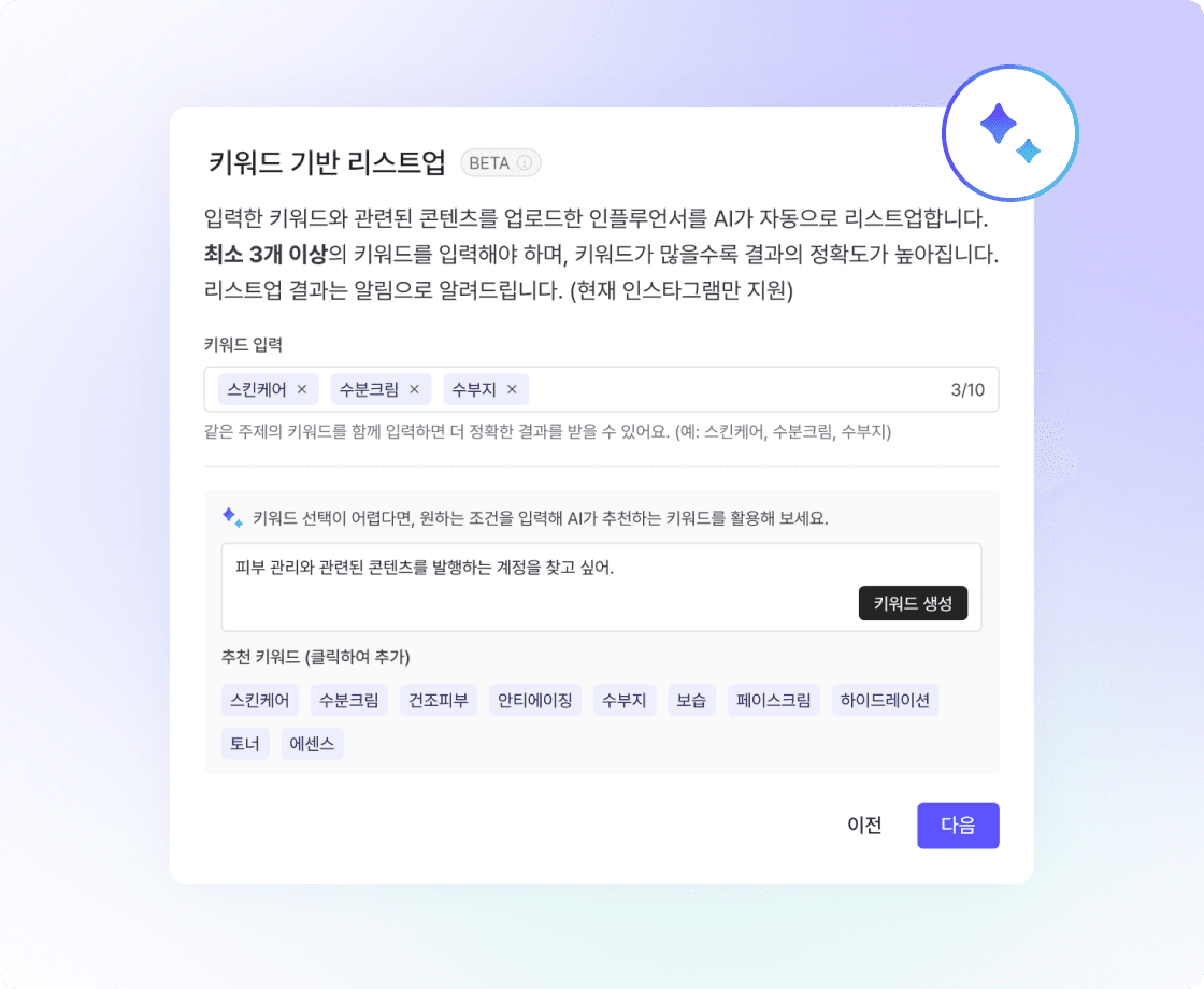 브랜드와 관련된 키워드를 입력하세요. 해당 키워드와 관련된 콘텐츠를 올린 인플루언서를 AI가 자동으로 찾아 추천합니다.
