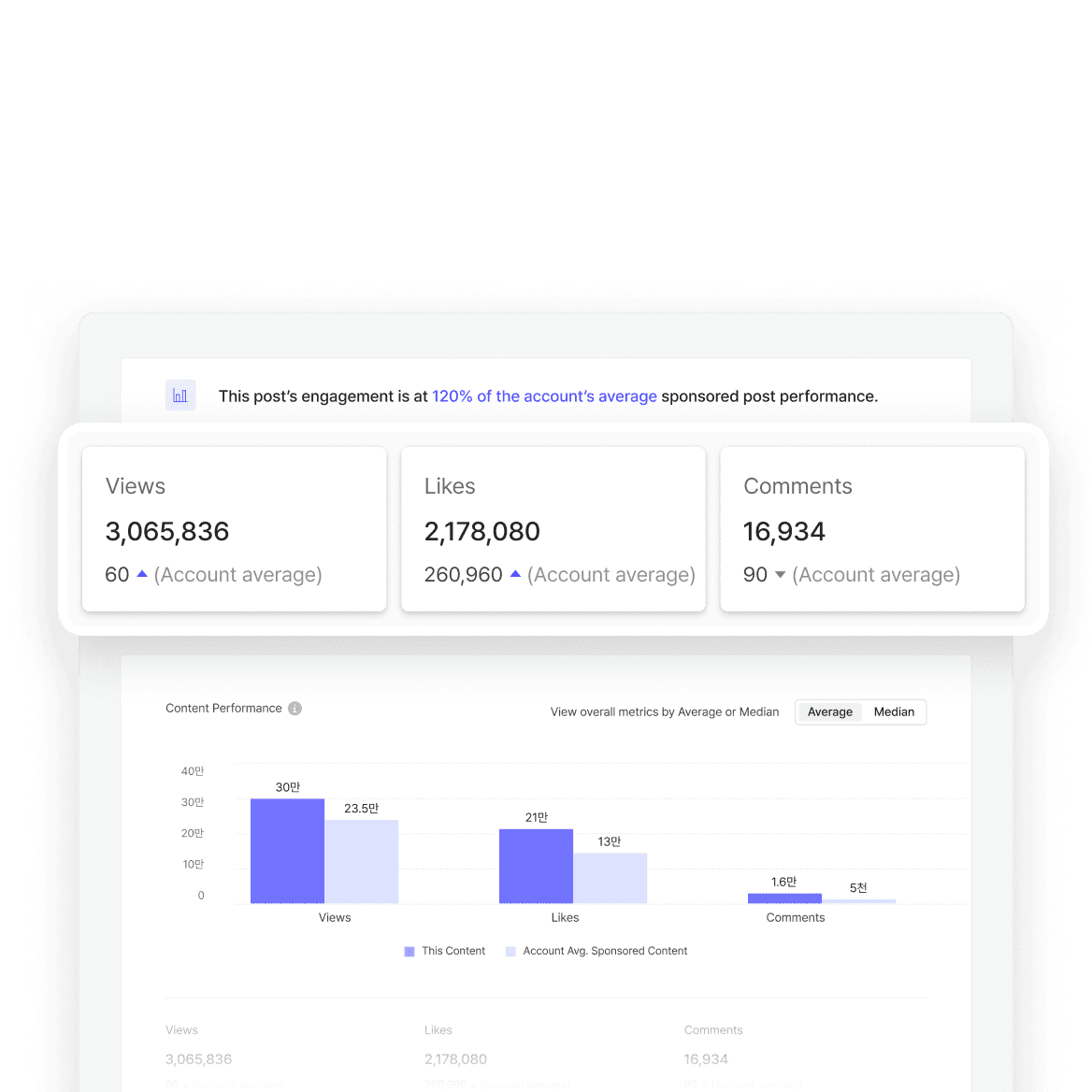 Compare selected sponsored content with account average metrics to evaluate overall performance.