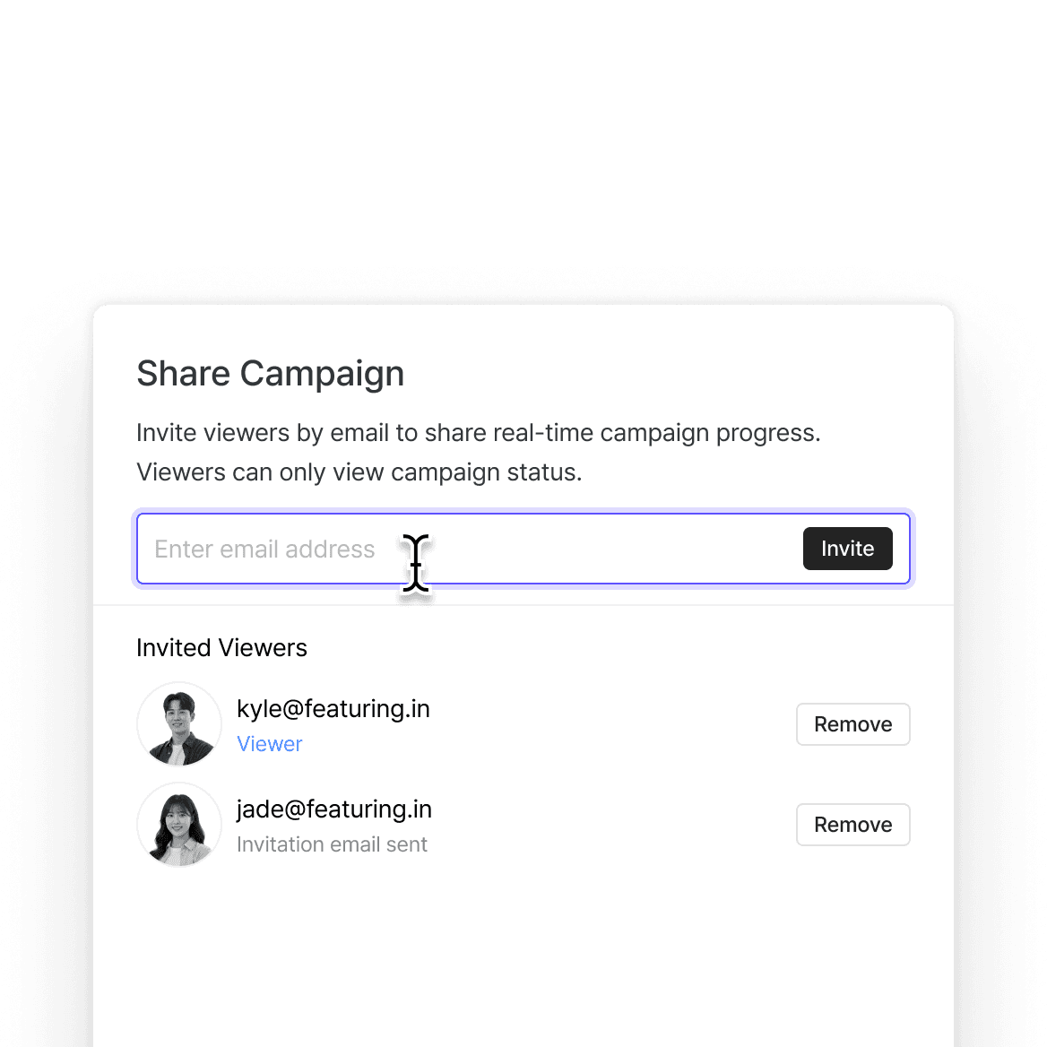 Invite teammates or partners by email and keep everyone updated with live campaign progress.