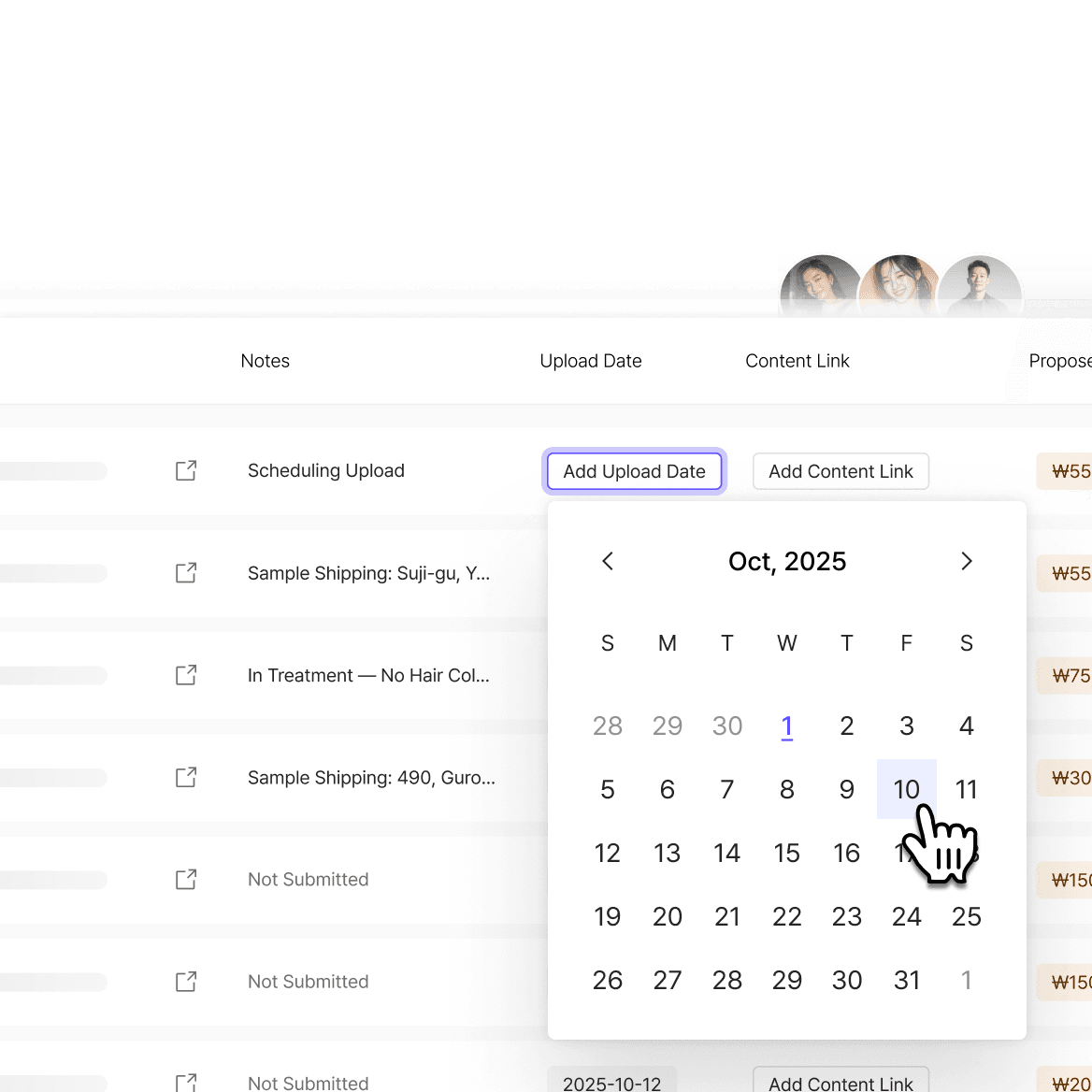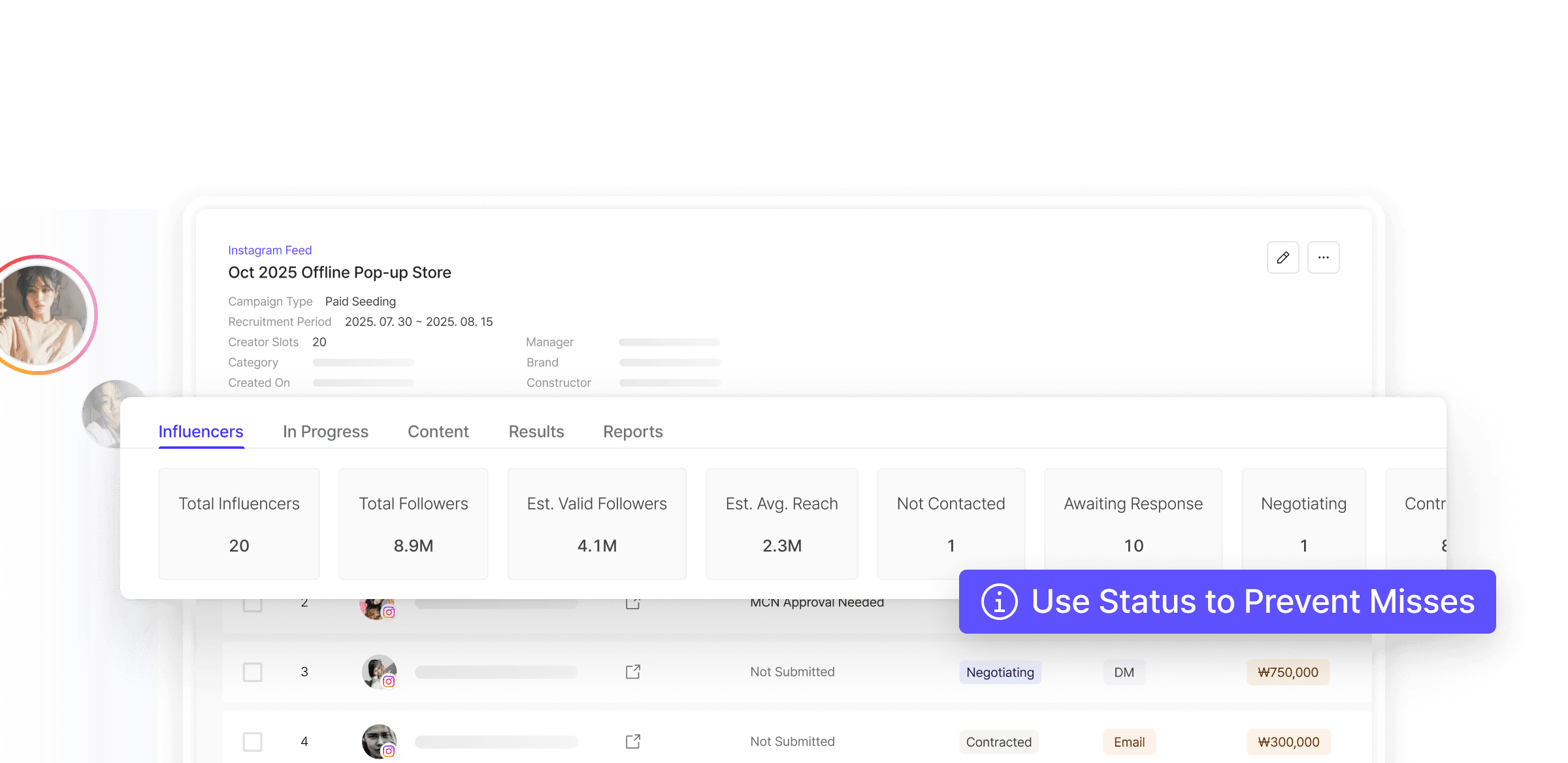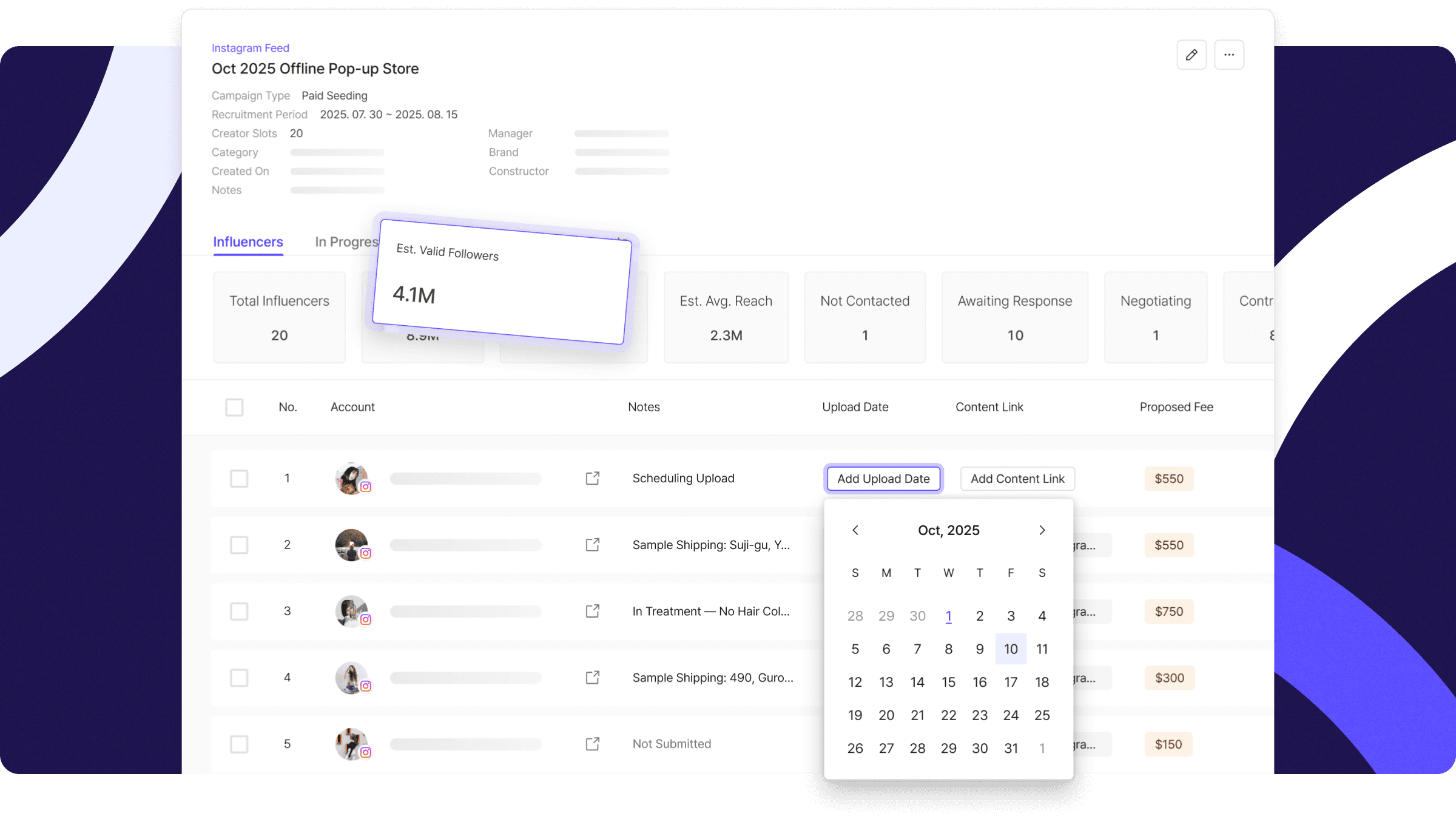 Track influencers, content, timelines, and budgets from a single dashboard.