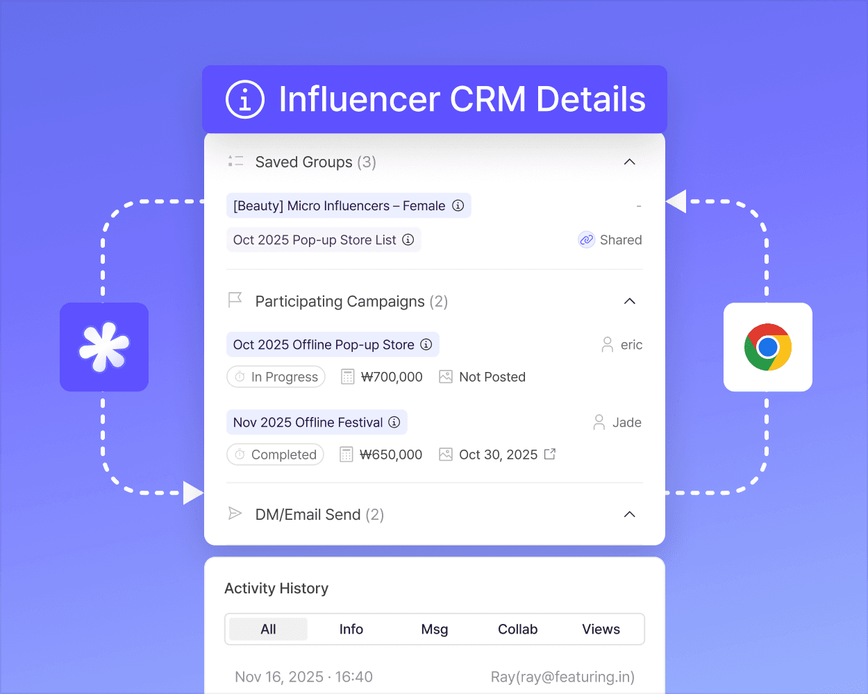 Influencers saved in the extension are automatically synced to Featuring Web. Manage groups, assign campaigns, and track activity — all in one place.